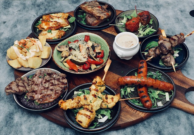 Mixed gril met rundvlees, lamsvlees en kip. Geserveerd met patatas bravas en gegrilde groenten.